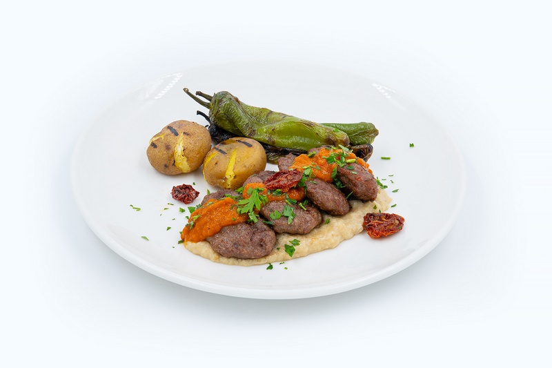 Izgara köfte , patlıcan beğendi , domates sosu , ızgara köy biberi , baby patates