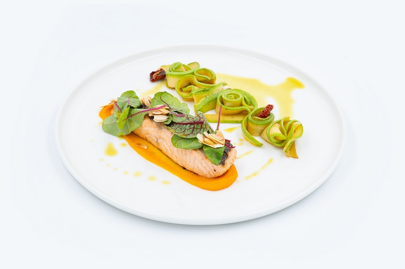 Izgara somon , Zencefilli havuç püresi , sote kabak , kuzu kulağı , kavrulmuş bademIi
