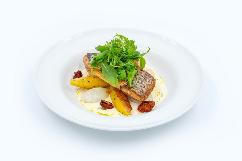 Tereyağında kızarmış kaya levreği ,balık patatesi , gümüş soğan konfit , roka salatası , limon sosu