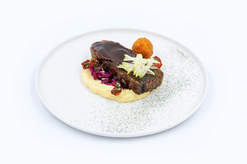 Ağır ateşte pişmiş dana kaburga , patates püresi , kırmızı lahana sotesi , konfit çeri domates , aranchini , şarap sosu