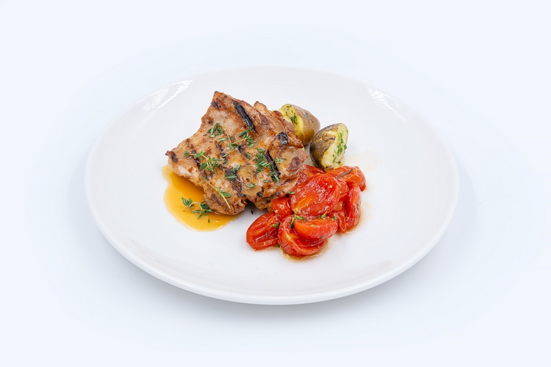 Izgara kemiksiz tavuk but ve göğüs , fırınlanmış baby patates , sote çeri domates , lime zencefil sosu