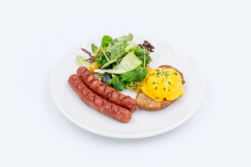 Dana Bratwurst sosis , bir adet poşe yumurta , hollandez sos , maskolin yeşillik , kırma yeşil zeytin , siyah zeytin , ekşi maya ekmek
