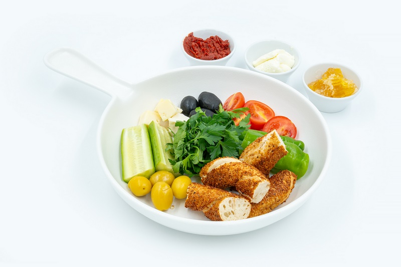 Ezine beyaz peynir , sokak simidi , çengelköy salatalığı , çeri domates , kırma yeşil zeytin , köy biberi , siyah kalamata zeytin , maydanoz