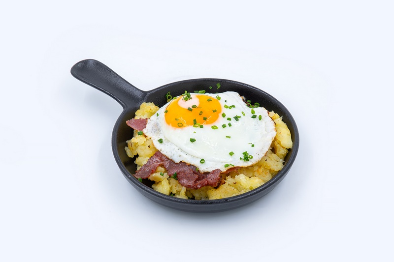 İşviçre usulu röşti patates , karamelize soğan , bir adet göz yumurta , dana füme