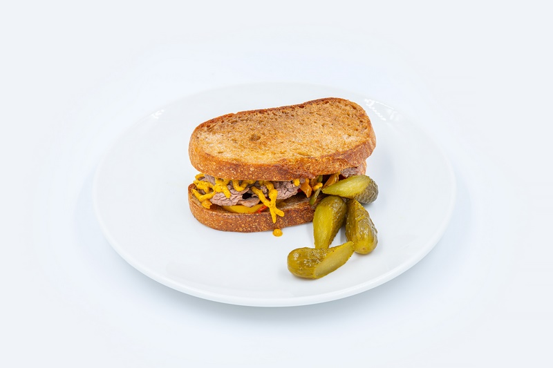 Ekşi maya ekmek , karamelize biber , dana bonfile dilimleri , arugula , hardal sosu , kornişon turşu