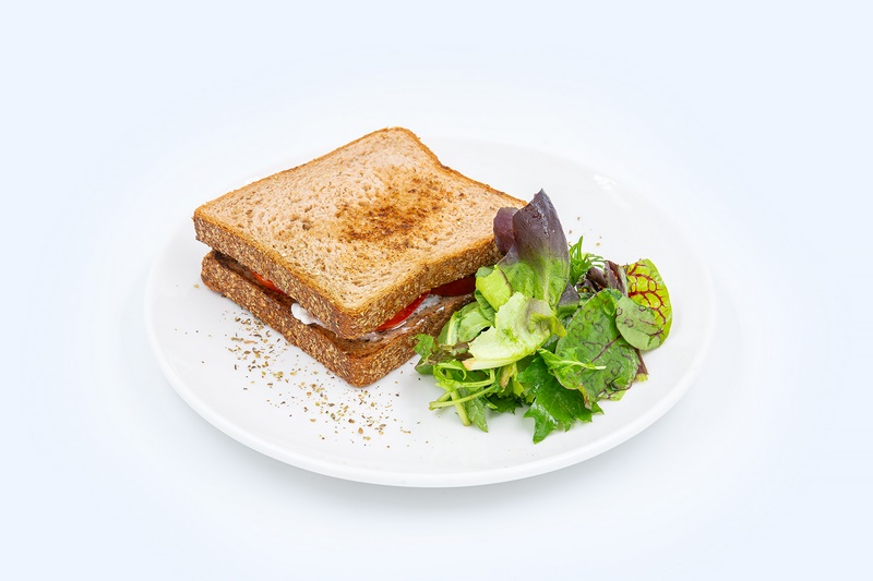 Kepekli tost ekmeği , yağsız beyaz peynir ve labne karışımı , zeytin ezmesi , kekik , pesto sos , domates , yeşil salata