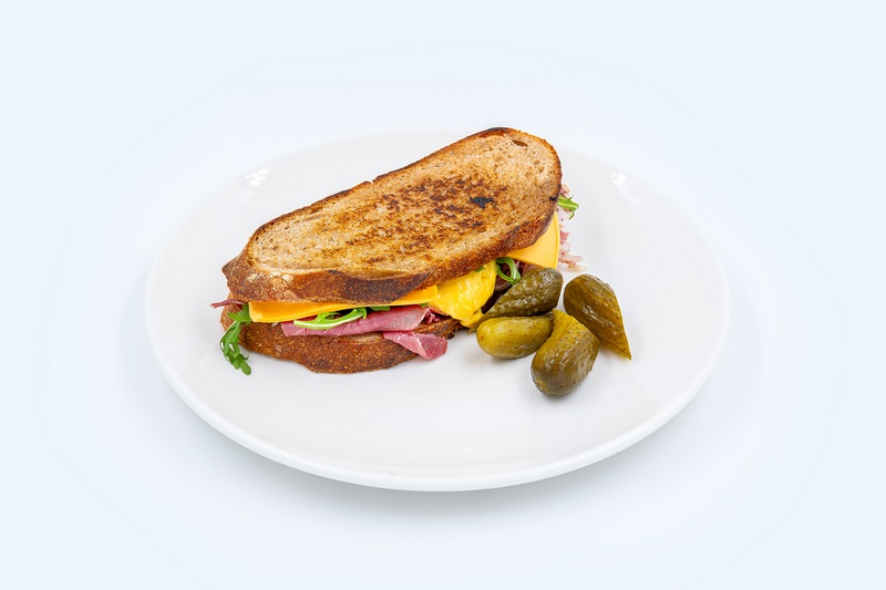 Ekşi maya ekmek , rozbif , acı biber reçeli , cheddar , arugula , limonlu aioli sos , turşu