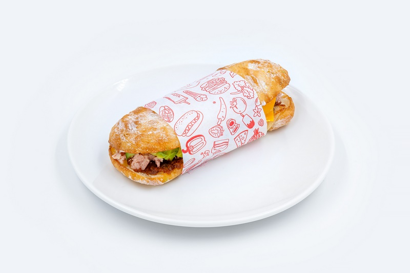 Ciabatta ekmeği , ton balığı , avokado , cheddar , karamelize soğan , chilli mayonez