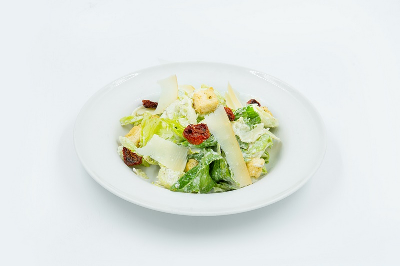 Klasik sezar sosu , marul yaprakları , sarımsaklı kruton , parmesan peyniri , kurutulmuş çeri domates
