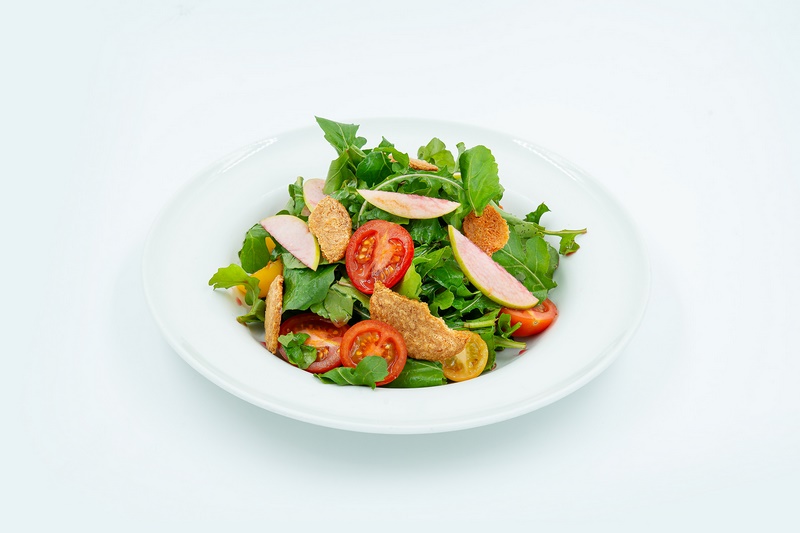 Aromatik peynirler ile hazırlanmış kraker , çıtır roka yaprakları ,renkli çeri domates ,yeşil elma , salatalık , sherry şarap sirkesi sosu