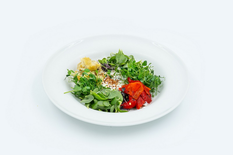 Köz Patlıcan , kapya biber , semiz otu , sarımsaklı süzme yoğurt , susam , mikro filizler , zeytinyağ limon Sosu