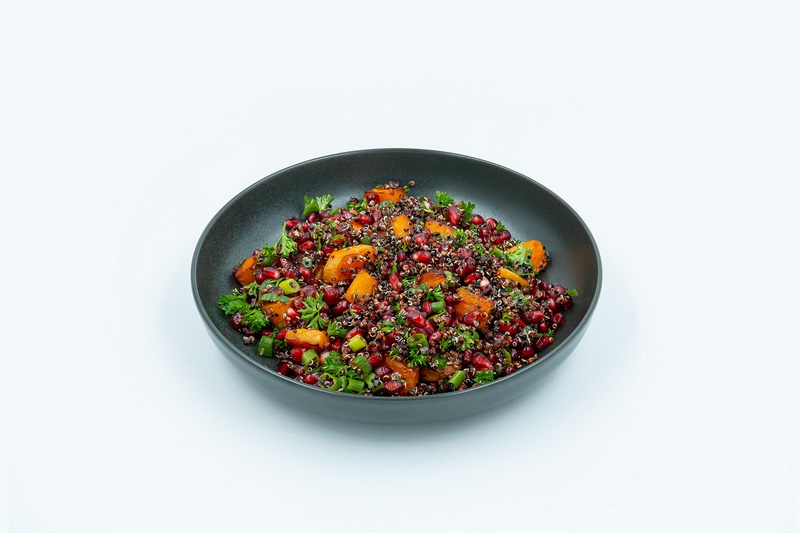 Fırınlanmış balkabağı , nar taneleri , taze soğan , frenk maydanozu , narenciye sosu
