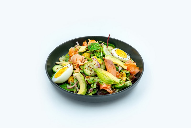 Somon füme , avokado , maskolin yeşillikleri , kavrulmuş susam , salatalık , kırma yeşil zeytin , kırmızı soğan , haşlanmış yumurta , ballı hardal sos
