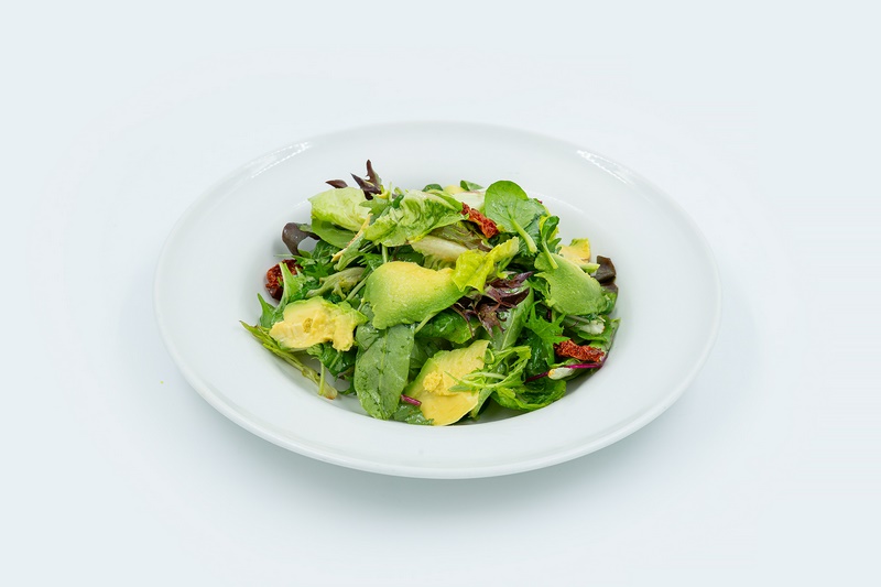 Göbek marul , maskolin yeşillik , avokado , kurutulmuş çeri domates , zeytinyağ limon sosu