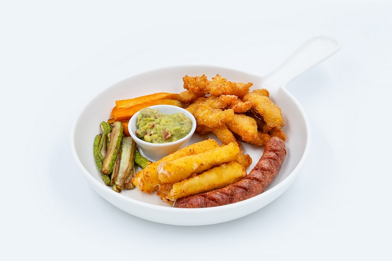 (2 kişilik) Tatlı patates , kabak , Bratwurst Sosis , mozarella stick , piliç pane , guacomole sos