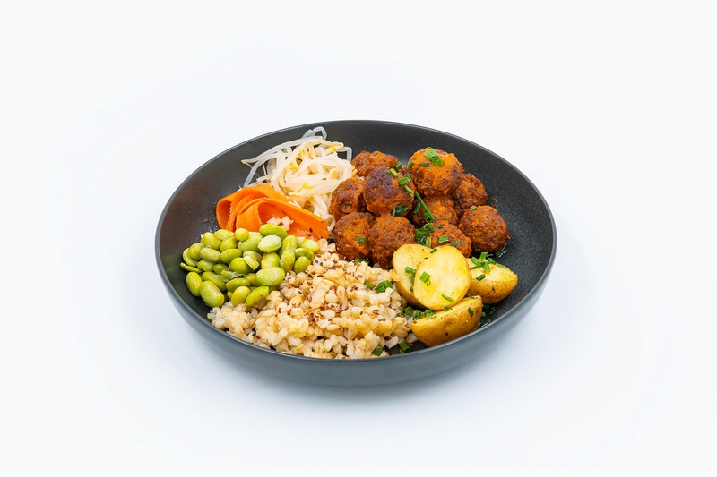 Edamame , bulgur , domates soslu köfteler , frenk soğanı , patates , havuç , soya filizi , susam
