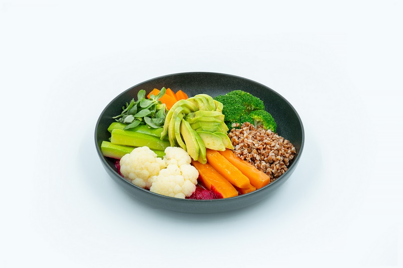 Fırınlanmış tatlı patates, havuç , kabak , haşlanmış brokoli , karnabahar , avokado , pancarlı humus , mikro filizler, semizotu , karabuğday