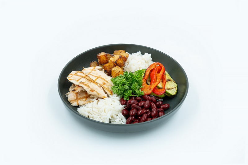 Izgara tavuk göğsü , basmati pirinci , fırınlanmış ananas , ızgara sebzeler , Meksika fasulyesi , maydanoz