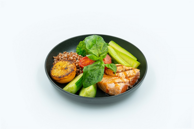 Izgara somon , Haşlanmış brokoli , çeri domates , salatalık , avokado , taze fesleğen , karabuğday , limon dilimleri
