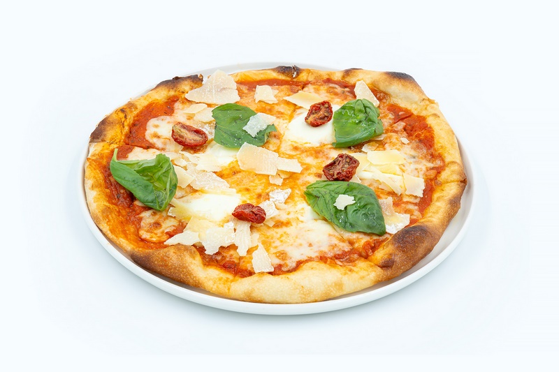 Pizza sosu , mozarella , taze fesleğen , kurutulmuş domates , sızma zeytinyağı , parmesan
