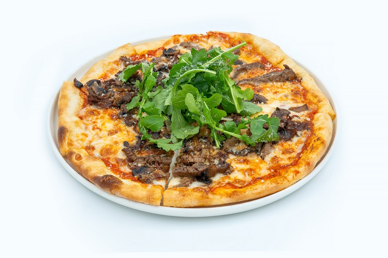 Pizza Sosu , mozarella , dana bonfile dilimleri , mantar , karamelize soğan , roka , parmesan , sızma zeytinyağı