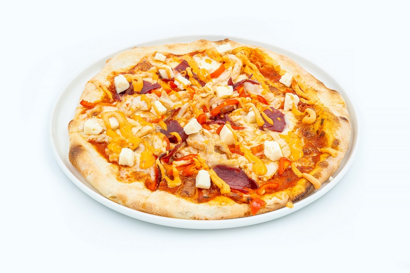 Pizza Sosu , mozarella , ezine peyniri , tavuk parçaları , kırmızı Meksika biberi , pastırma , buffalo sosu