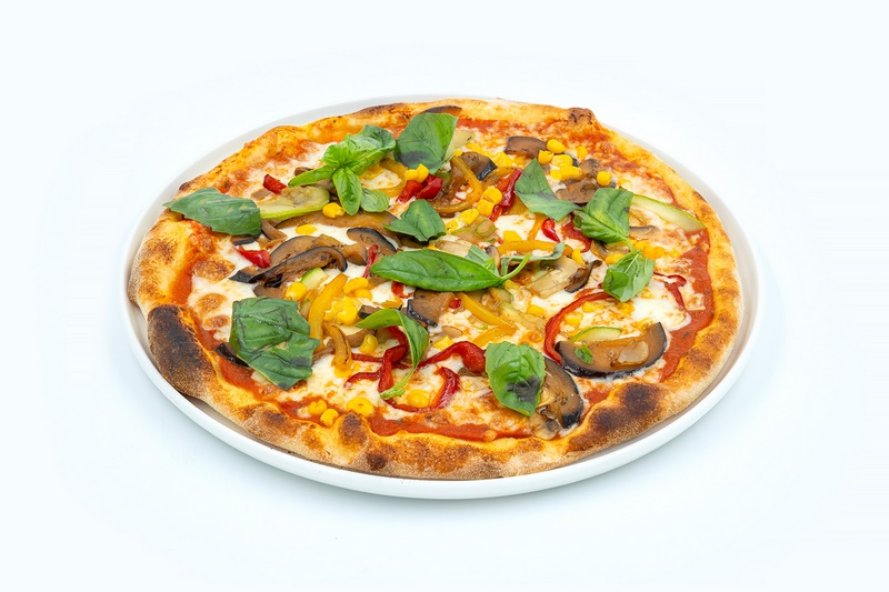 Pizza Sosu , mozarella , kabak , patlıcan , sarı ve kırmızı Meksika biberi , mantar , mısır , taze fesleğen , sızma zeytinyağı