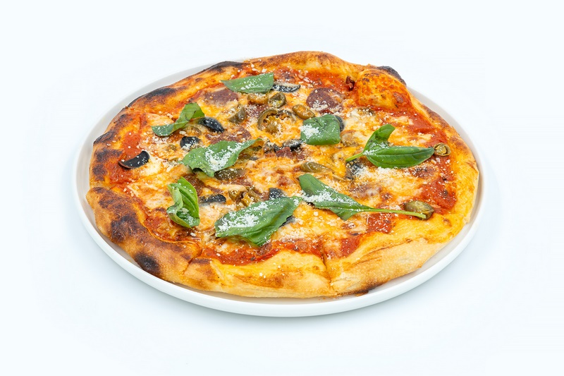 Pizza Sosu , mozarella , pepperoni sucuğu , jalepeno biberi , kalamata zeytin , taze fesleğen , parmesan , sızma zeytinyağı