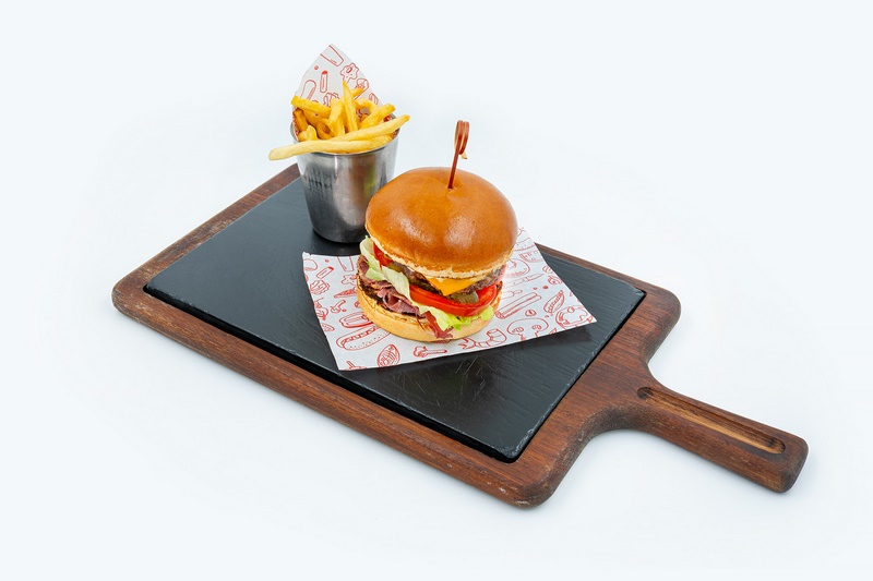 Hamburger köftesi , marul , domates , salatalık turşusu , isli kuru et , karamelize soğan , cheddar , burger sosu , patates kızartması