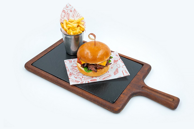 Özel soslu dana tandır , karamelize soğan , fırınlanmış domates , roka , cheddar , patates kızartması