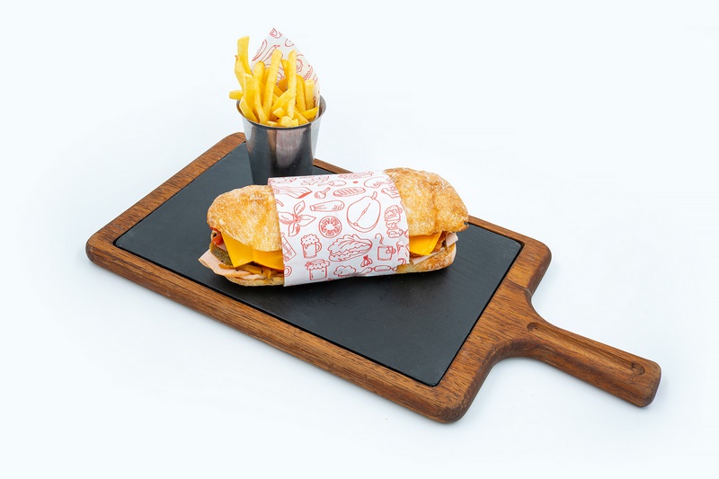 Izgara pane tavuk göğsü , hindi füme , karamelize biber sotesi , guacamole sosu , cheddar , karamelize soğan , patates kızartması